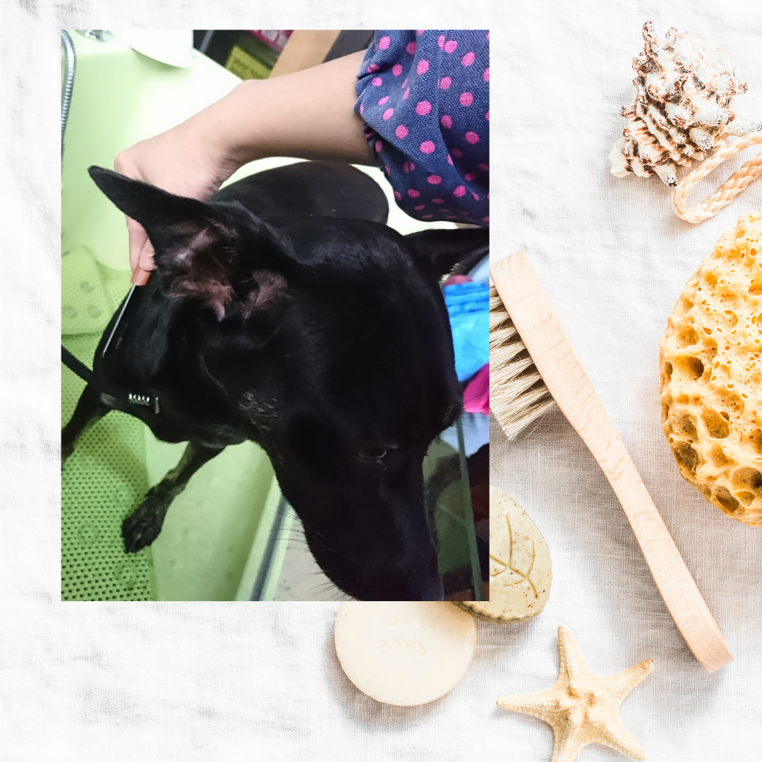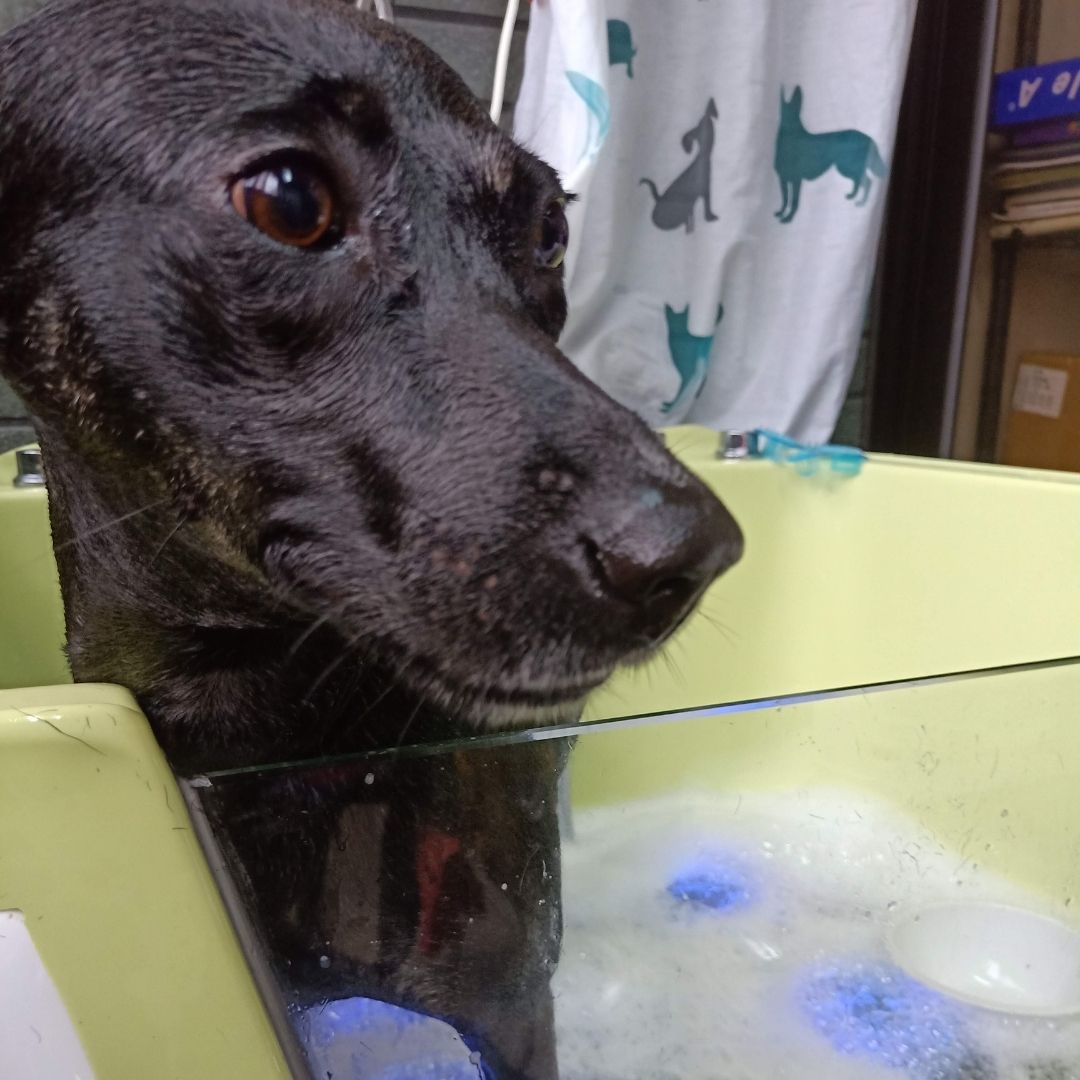 這隻米克斯叫嘿梅,從小在我這邊洗澡,從小就很不喜歡洗澡感到恐懼。她的焦慮從進門口就開始,尾巴下垂,耳朵下垂,還有分離焦慮症,只要離開爸拔,會巷頭叫到巷尾的哭喊聲,連上洗澡台都是四肢打開完全撐住浴缸邊邊,不想進去。